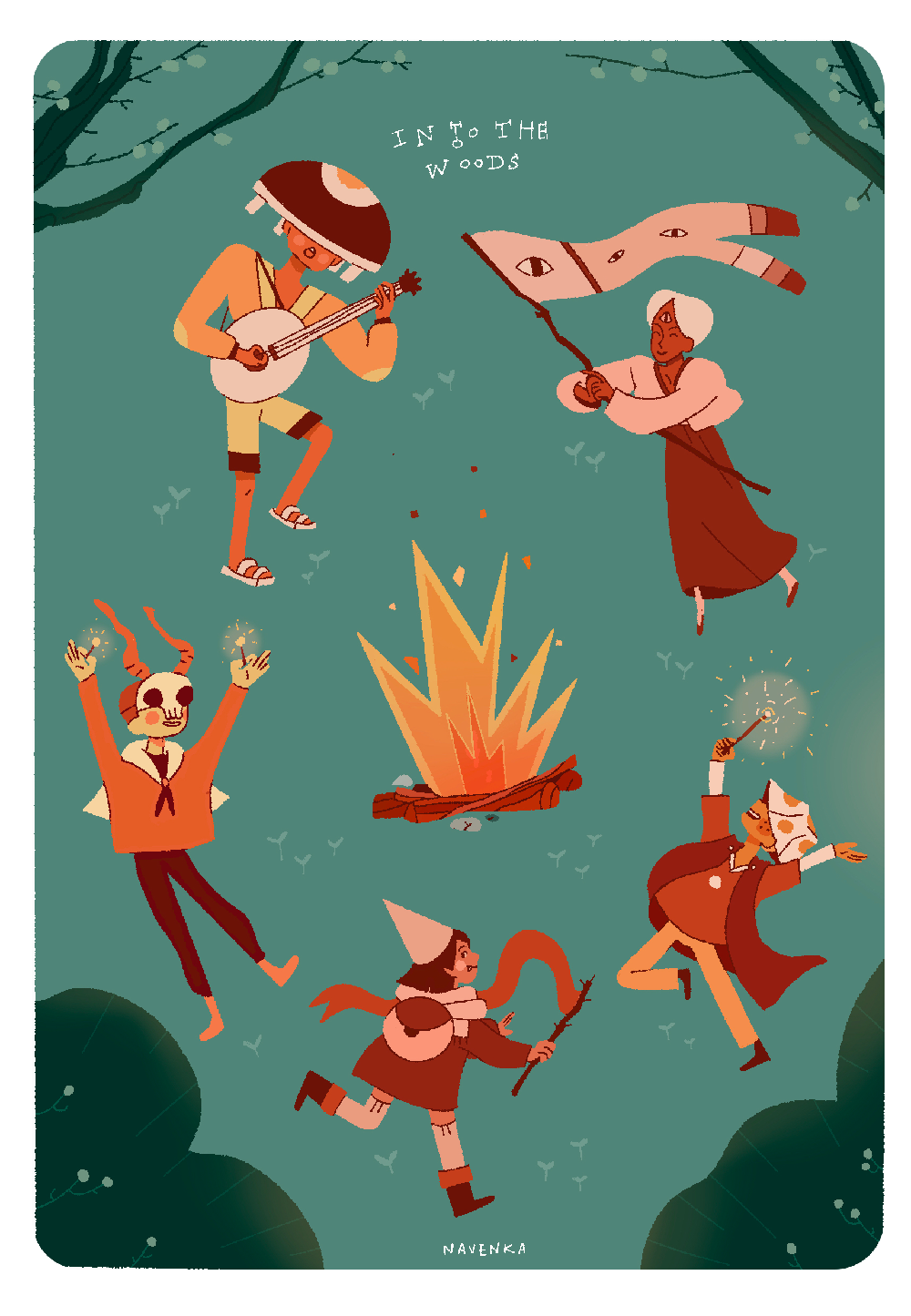 Description Print 15 x 22cm | “Forest Fiesta” A bunch of little people party for the spirits of the forest ! Let’s hope they don’t wake up the Wildman.